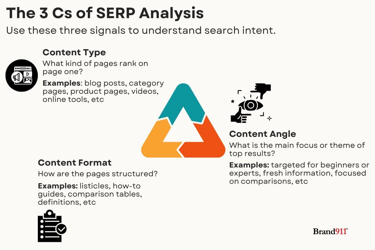 The fastest way to determine search intent is to analyze the SERP using the Three C’s: Content Type, Content Format, and Content Angle.