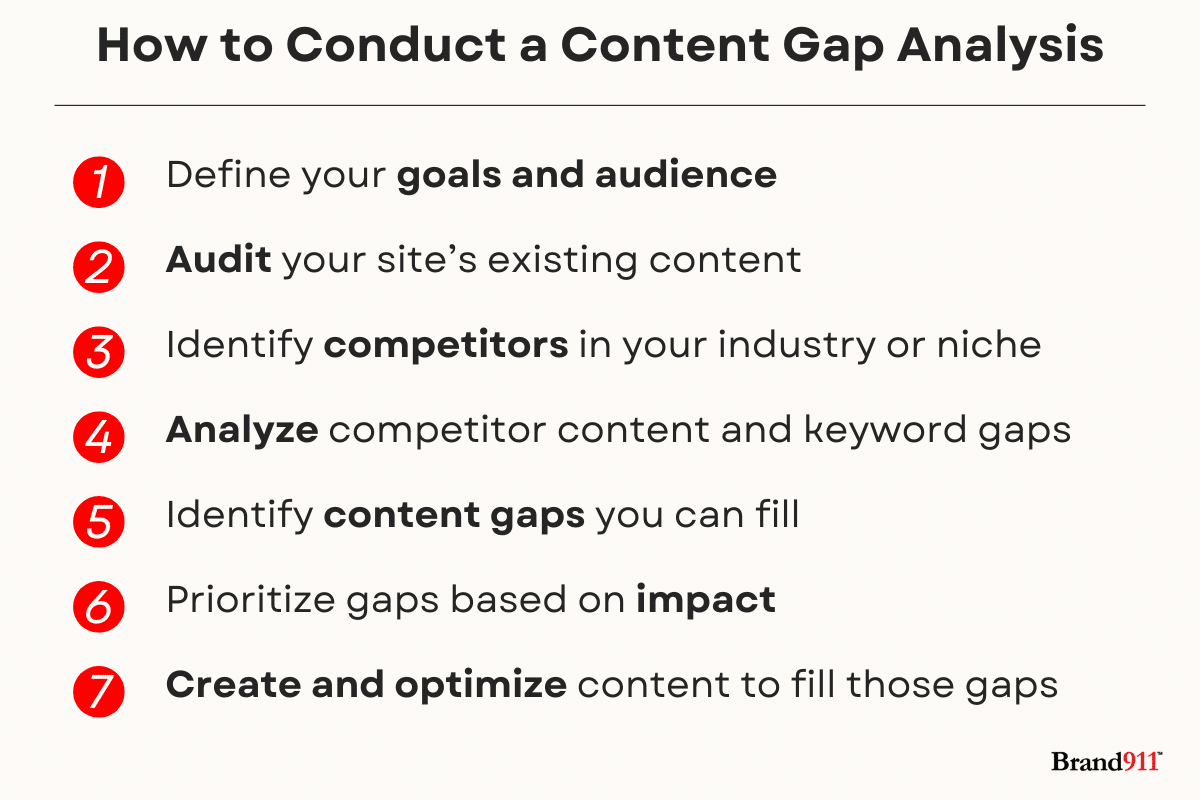 At this point, you should have a clear view of what exists on your site and what competitors are doing better. Now it is time to identify the gaps you can realistically fill.