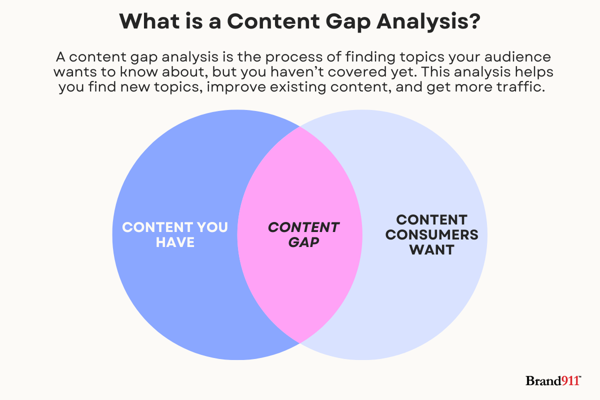 A content gap analysis is the process of finding topics your audience wants to know about, but you haven’t covered yet. This analysis helps you find new topics, improve existing content, and get more traffic.
